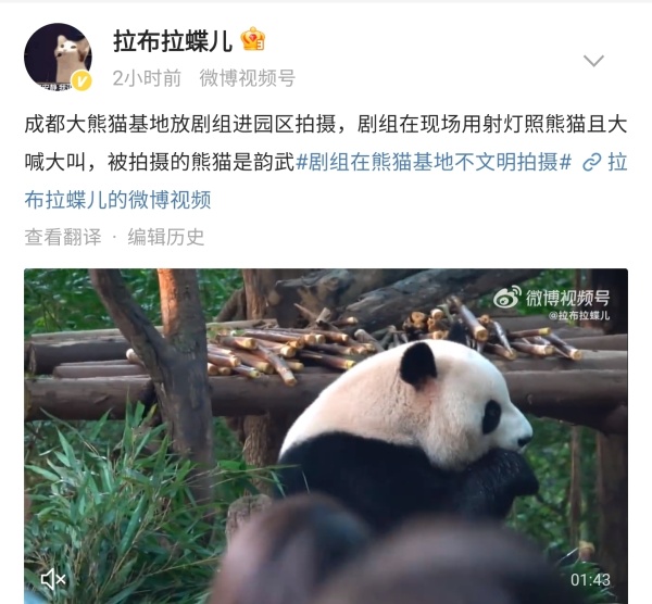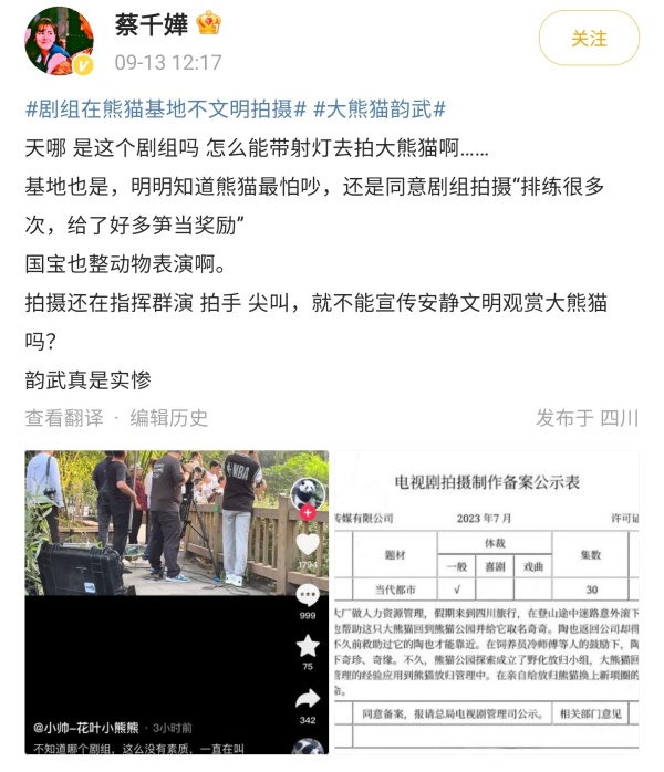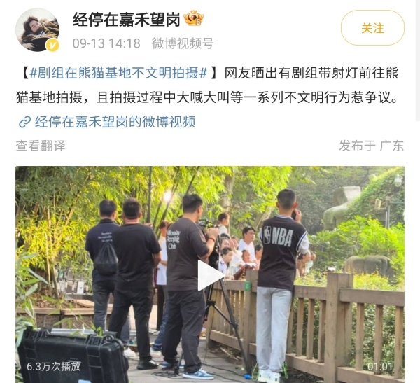 9月13日,有媒体爆料称某剧组在四川熊猫基地不文明拍摄,引发了网友的热议。