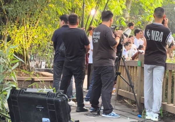 按照爆料网友的说法,有剧组带着射灯和各种拍摄设备进入了熊猫基地园区,在一处栅栏外,聚集了大量的演员开始拍摄。