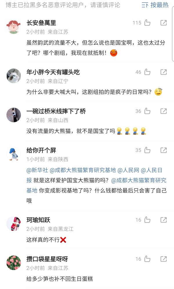 这个视频曝光以后,引发了许多网友的愤怒,有疑似了解大熊猫的网友透露说,大熊猫其实是非常怕吵的,不知道为什么园区会同意这个剧组去拍摄,并且还允许排练了很多次。