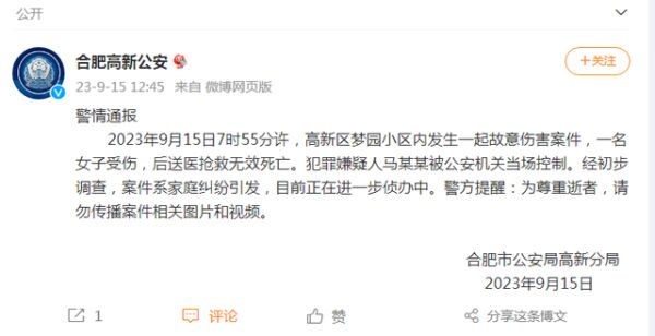 刚刚,@合肥高新公安 发布警情通报:2023年9月15日7时55分许,高新区梦园小区内发生一起故意伤害案件,一名女子受伤,后送医抢救无效死亡。犯罪嫌疑人马某某被公安机关当场控制。经初步调查,案件系家庭纠纷引发,目前正在进一步侦办中。警方提醒:为尊重逝者,请勿传播案件相关图片和视频。