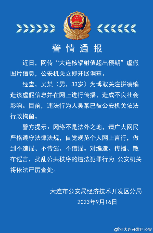 中新网9月16日电 据大连市公安局开发区分局官方微博消息,近日,网传“大连核辐射值超出预期”虚假图片信息,公安机关立即开展调查。