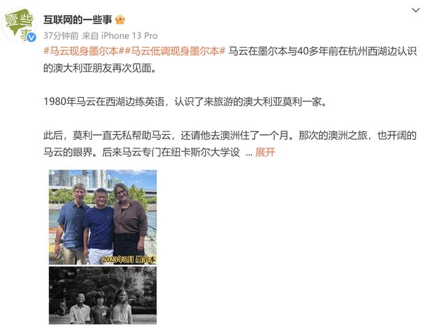 导读:近日,58岁的马云低调现身墨尔本,其和澳洲友人合影也在社交平台被发布。据悉,与其合影者是40多年前在杭州西湖边认识的澳大利亚朋友。