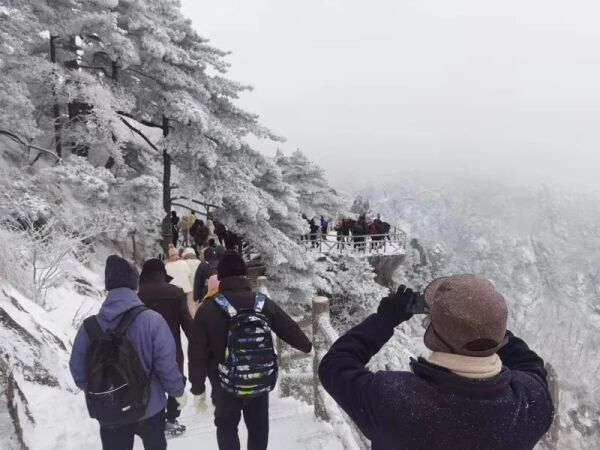 瑞雪兆丰年,经过一天的降雪,五百里黄山已披上银色的盛装。黄山松披上了厚厚的冬装,迎风而立,有的覆盖在整个松树树冠上,宛若一把撑开的洁白雨伞,有的点缀在松针上,一缕缕、一簇簇,宛若盛开的梨花。在云遮雾绕中,黄山诸峰仿佛被粉雕玉琢一番。在阳光的照射和蓝天的映衬下,更现迷人魅力。游客们一路欢笑一路欣赏,相机、手机拍个不停,春节的黄山显得格外热闹。