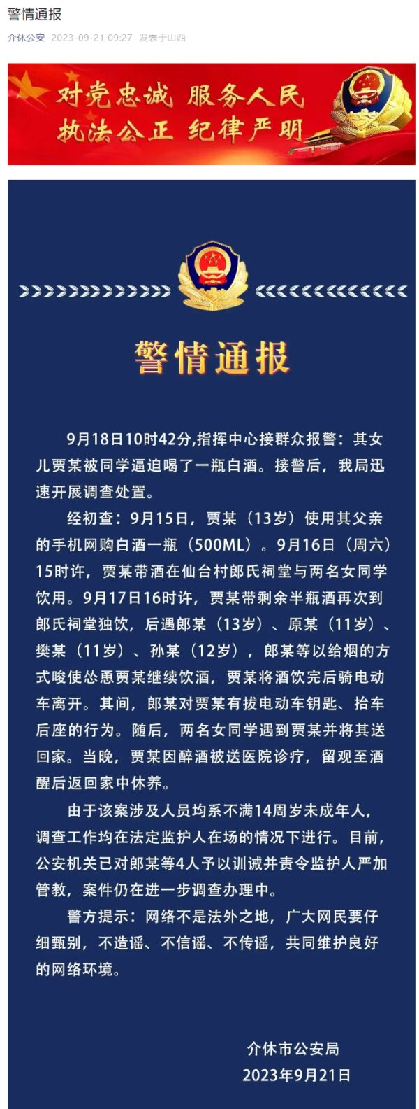 9月18日10时42分,指挥中心接群众报警:其女儿贾某被同学逼迫喝了一瓶白酒。接警后,我局迅速开展调查处置。