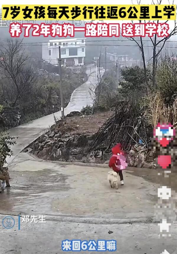 据了解,这段视频是贵州安顺的邓先生发布的,视频中的女孩正是他的7岁女儿。此前,邓先生在接受媒体采访时介绍,他和妻子几年前已经离婚,自己在外地打工,孩子的爷爷奶奶年事已高也不会骑车。女儿正在读小学,每天独自往返6公里徒步上下学,家中的一只狗经常护送孩子到学校。