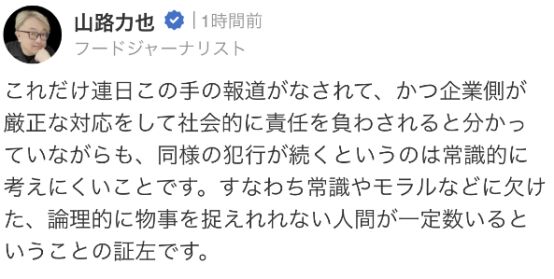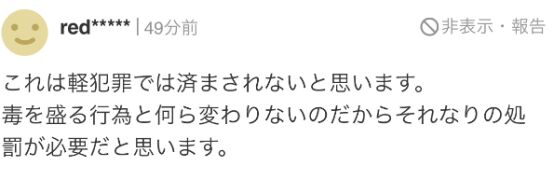 雅虎新闻平台账号认证为饮食记者的山路力也评论称,“关于此类事件的新闻这些天连续被报道,而且也知道(运营)公司方面会严正处理此事,会导致犯事者承担社会责任,但仍然还出现类似的犯罪,从常识上来说很难想象。这就代表有一定程度数量的人缺乏常识和道德,无法理性看待事物”。