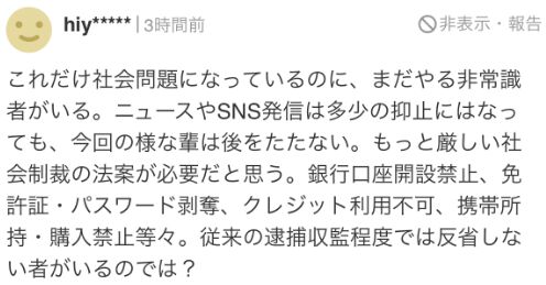 还有人说,“这种事件已经成为如此严重的社会问题了,还有人干这种不讲规矩的事。虽然新闻报道和网络上的声音能或多或少地约束这种情况,但这种家伙还是层出不穷。应该通过法案以给予更严厉的社会制裁。禁止银行开户、吊销驾照护照、禁止使用信用卡、禁止购买或持有移动手机等等。现有的逮捕关押系统不能让一些人反省”。