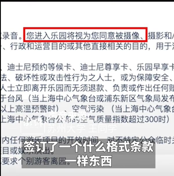 对此,迪士尼回复表示,游客在入园时已经和园方签订了条款须知。