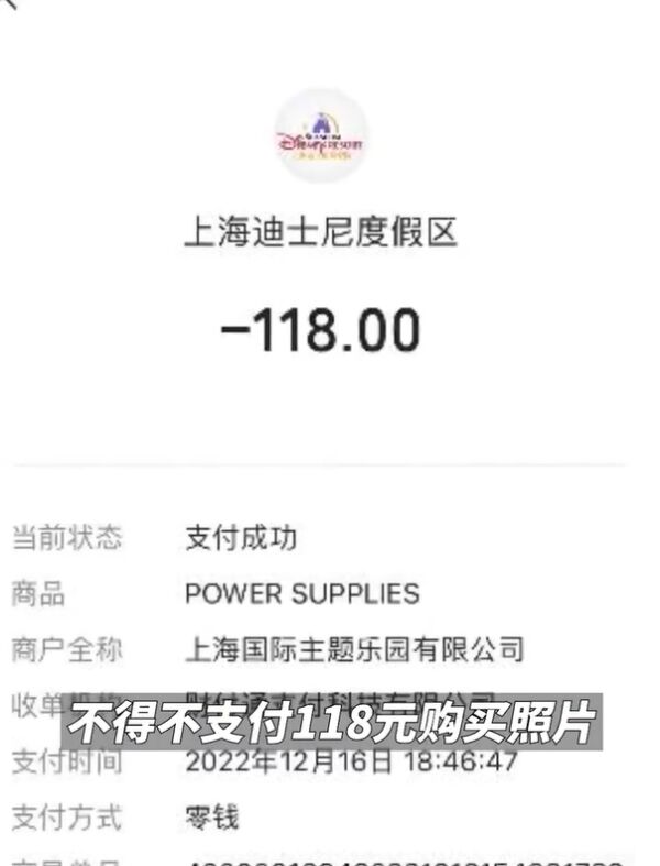 去年12月16日,王同学和朋友一起去上海迪士尼乐园游玩,在创极速光轮项目游玩结束后,工作人员告知王同学一行,乐园拍摄了大家游玩时的照片,可以以118元一张的价格出售给游客。