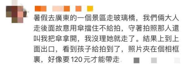 近日还有网友发视频称,河北省武安市东太行景区玻璃栈道处有景区工作人员拍摄游客照片,并在出口处将洗好的照片挂在一旁展示,由于不想让自己的游客照挂在景区,最终只好花10块钱买走了。