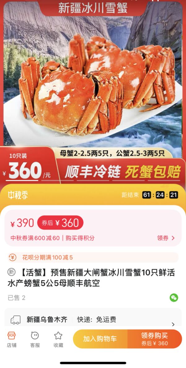 今天,新疆大闸蟹的预售已经开始,在淘宝搜索“新疆大闸蟹”、“冰川雪蟹”等都能买到。这批蟹预计25号发货,也就是说,最快今年中秋的餐桌上就能有新疆的大闸蟹。接下去,淘宝还会引入更多新疆大闸蟹,能一直卖到双11。