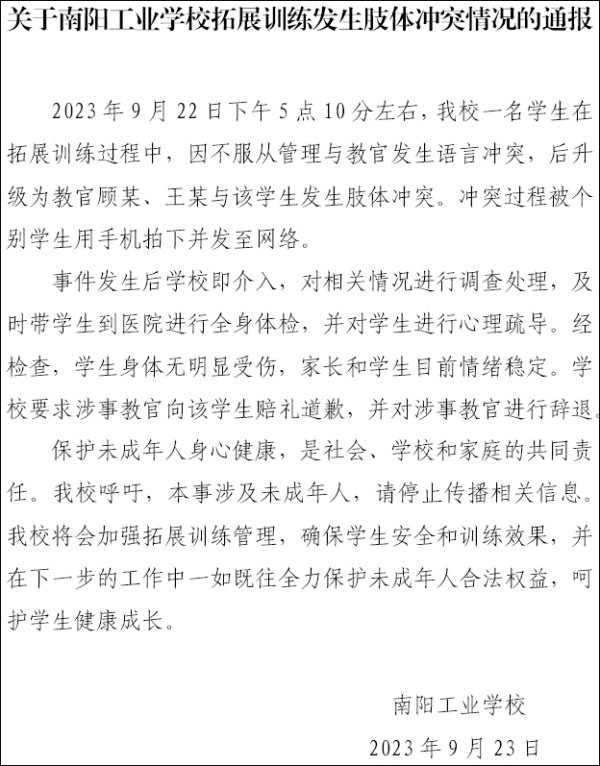 微信公众号“河南省南阳工业学校”9月23日发布《关于南阳工业学校拓展训练发生肢体冲突情况的通报》。
