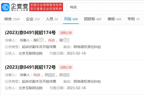 企查查APP显示,近日,北京互联网法院公告两则有关肖战诉吕某、周某网络侵权责任纠纷的起诉状副本及开庭传票。具体内容为自公告之日起经过30日,即视为送达。提出答辩状的期限为公告送达期满后次日起15日,并定于答辩期满后第3日下午16时(遇法定休假日顺延)在网络法庭公开审理此案。