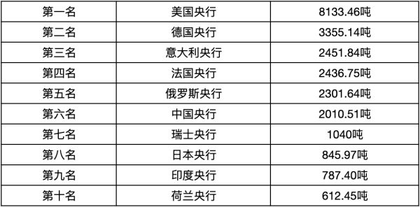截至2022年度,全球囤金前十的央行分别为: