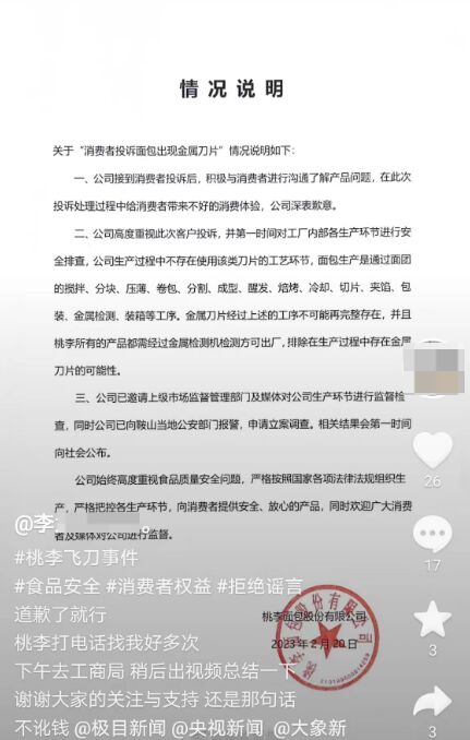 2月20日中午,桃李面包发布情况说明称,关于“消费者投诉面包出现金属刀片”说明如下:
