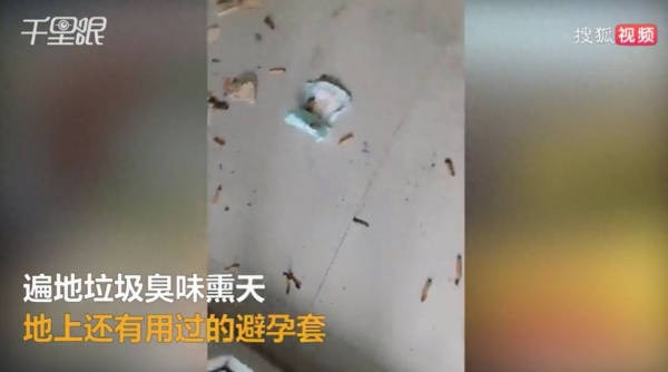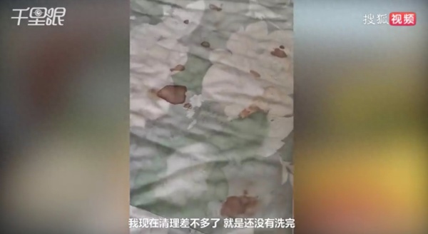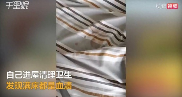 房东于女士进屋清理卫生才发现满床都是血渍,遍地垃圾臭味熏天,地上还有用过的避孕套。