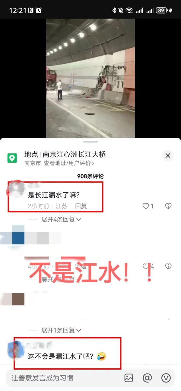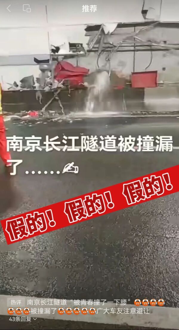9月27日上午网上流传“南京长江隧道被撞漏了”的不实信息,请广大网友不要相信,撞破的是消防水管,并已于当日凌晨维修完毕,该隧道当日早晨6点已恢复正常交通,请广大市民放心通行。