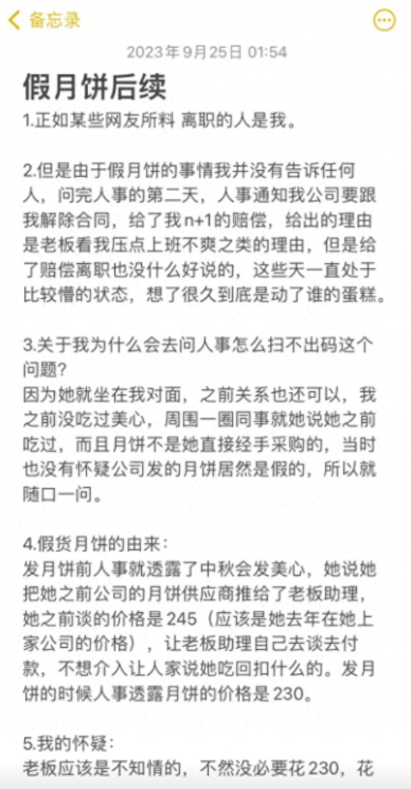 9月25日,女子称自己在问完人事的第二天,被人事通知解除合同,给了N+1的赔偿。女子称人事透露月饼是230元买的。