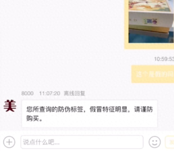 随后,询问公司的人事却被指事多,便在线上询问官方客服,客服回复:您所查询的防伪标签,假冒特征明显,请谨防购买。