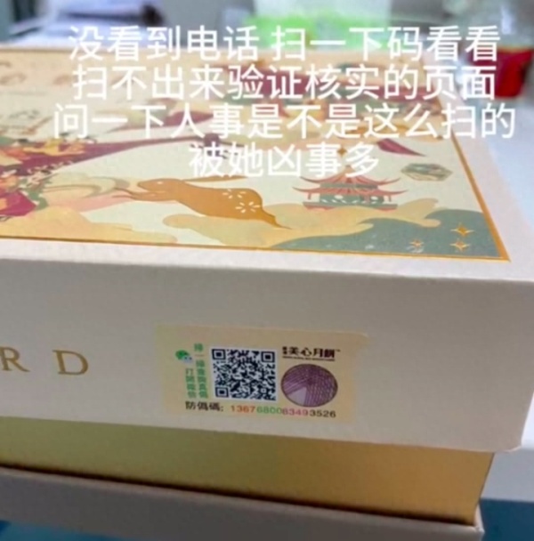 当事女子表示,自己在月饼中吃到毛发后,准备打电话投诉,却发现包装上没有客服电话,扫包装上的二维码也扫不出内容。