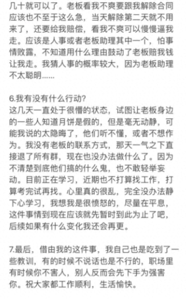 “老板觉得不爽也没必要第二天就开除我,应该是人事或老板助理其中一个,怕失去败露了。不知道用了什么理由鼓动了老板赔我钱让我走。”