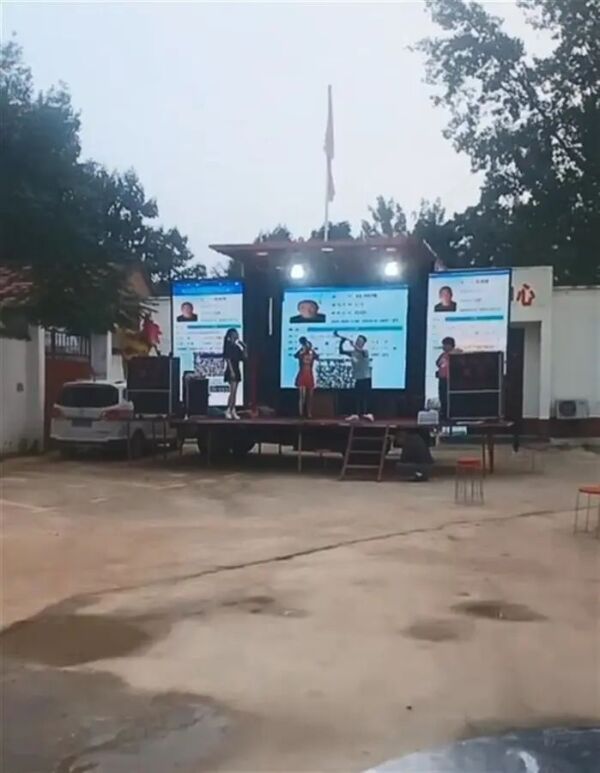 视频显示,村内广场好不热闹,舞台下坐着观众,舞台上唢呐、锣鼓声起,灯光闪烁,三块大屏幕上播放着一张驾驶证。舞台旁边悬挂着多条横幅,均是祝贺任先生三年来锲而不舍,终于考得驾照。