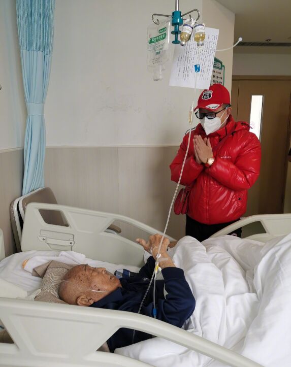最后一张是任凤坡躺在病床上给六小龄童点赞,六小龄童则双手合十作揖,有一种当年《西游记》的角色宿命感。