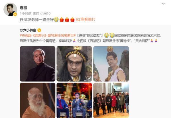 2月20日,六小龄童发文透露央视版《西游记》副导演、国家京剧院著名京剧表演艺术家、导演任凤坡先生病逝,享年83岁。
