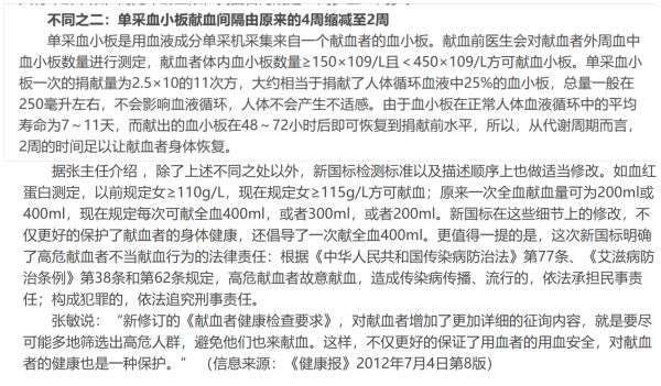 王海燕称,按照我国《献血法》第九条规定,血站对献血者每次采集血液量一般为200毫升,最多不得超过400毫升,两次采集间隔期不少于6个月。同时根据我国新版《献血者健康检查要求》规定,单采血小板献血间隔不少于2周,不大于24次/年。因特殊配型需要,由医生批准,最短间隔时间不少于1周。