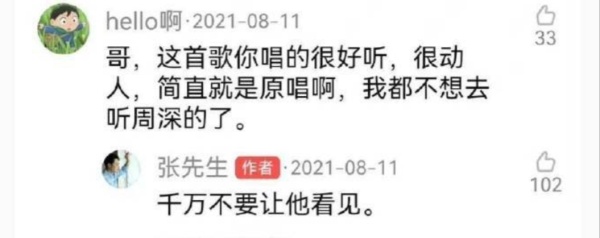 大家还发现了张颂文老师的全民K歌账号,张颂文老师唱歌没有技巧,全是感情,而且歌曲涉猎非常广泛,可以说是很可爱了。同时,大家还发现张颂文老师还唱过周深的《听我说》,又是一波梦幻联动!只能说优秀的人是会互相欣赏的。在k歌上唱完之后还被粉丝评论了,张颂文老师还回复道,千万不要让他看见,可以说是非常可爱了。