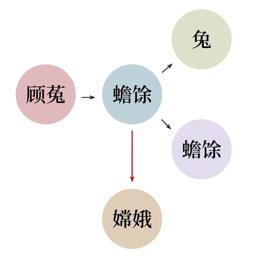 考月中阴影,古者传说不一,《天问》而外,先秦之说,无足征焉。其在两汉,则言蟾蜍者莫早于《淮南》,两言蟾蜍与兔者莫早于刘向,单言兔者莫早于诸纬书。由上观之,传说之起,谅以蟾蜍为最先,蟾与兔次之,兔又次之。更以语音讹变之理推之,盖蟾蜍之蜍与兔音近易混,蟾蜍,变为蟾兔,于是一名析为二物,而两设蟾蜍与兔之说生焉。