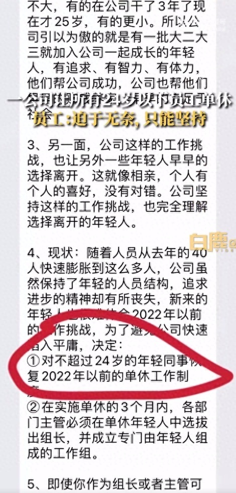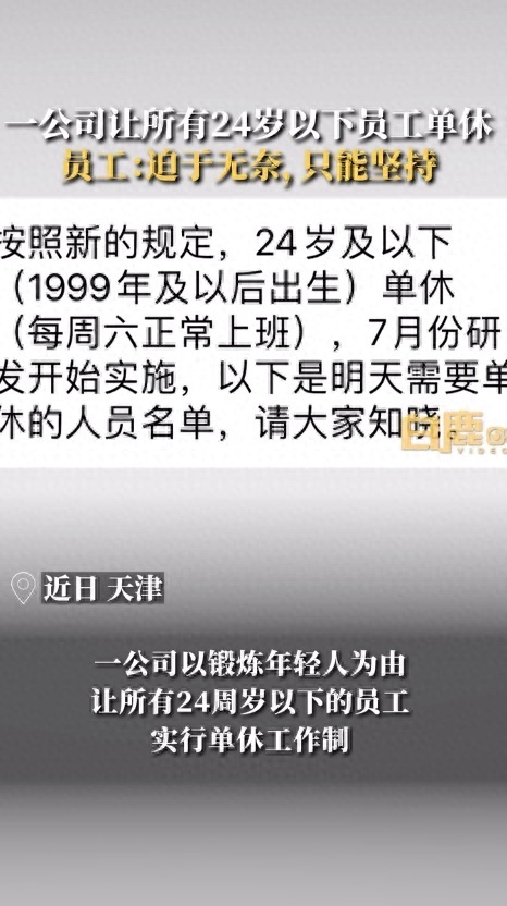 9月29日,据白鹿视频,近日天津一公司让所有24周岁以下的员工实行单休工作制,引发争议。