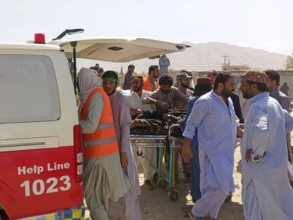 9月29日,救援人员在巴基斯坦俾路支省默斯东地区转移伤者(手机拍摄)。图源:新华社