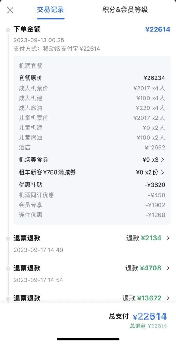 第一次下单时间是在9月13日,在旅游平台上连着“酒店+机票+租车”一起预订,共花费22614元。看到新闻后试了下退款再重新预订,这次总计花费17124元。相比之下,一来一去人均省了900多元,6个人的旅游总开销就省下5490元。