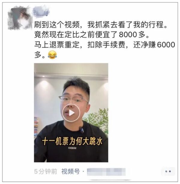据都市快报,杭州女士丹丹在手机上刷到一段“十一机票为何大跳水”的视频,立马就去看了自己之前订的行程,竟然真的比之前便宜了5000多元。