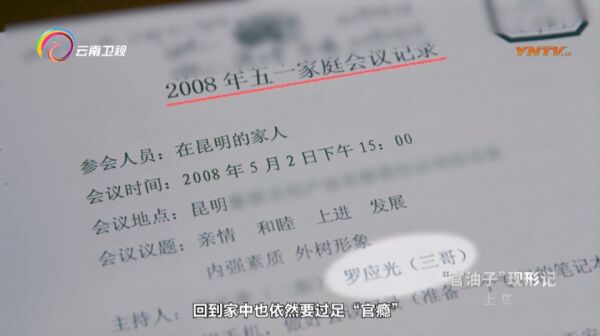 专题片披露,罗应光不仅在工作中、单位里享受众星捧月的感觉,回到家中也依然要过足“官瘾”。他家经常开家庭会议,竟然也有“秘书长”“副秘书长”,还要发会议纪要。