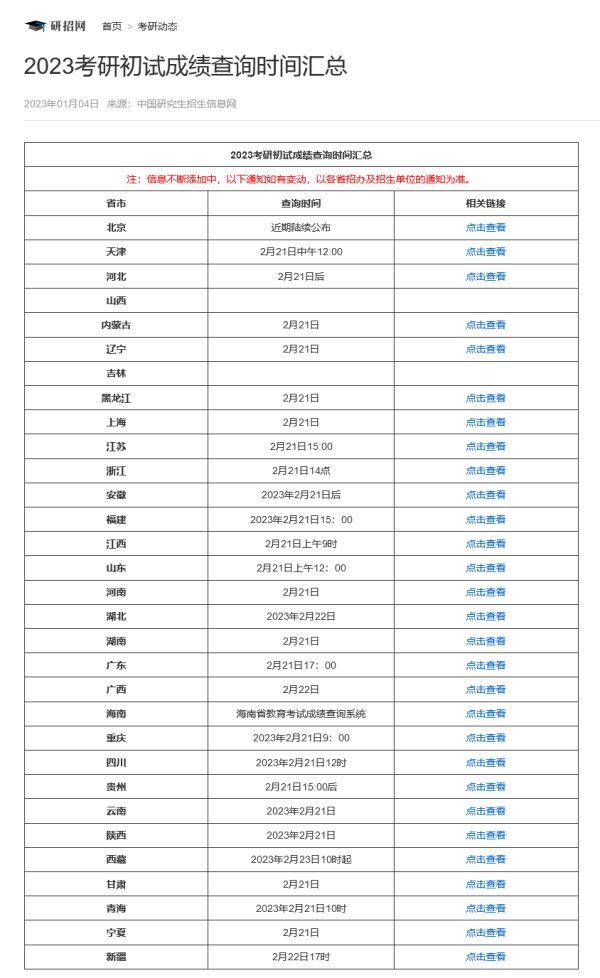 另据中国研究生招生信息网消息,各地考研初试成绩查询时间陆续公布。