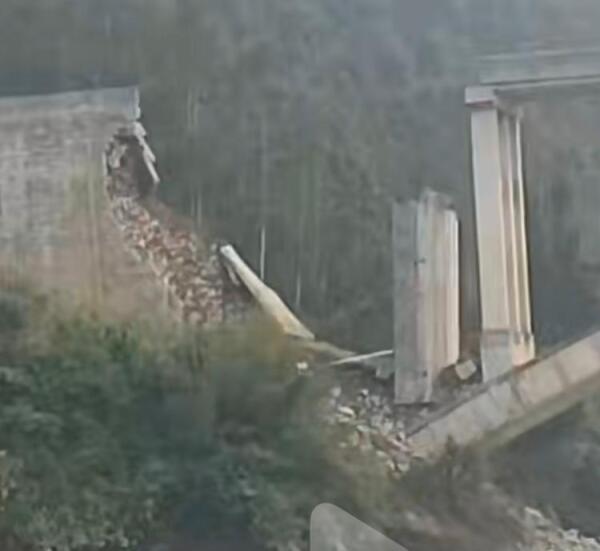 在当地网友拍摄的视频中可看到,该大桥连接山体的一侧桥头坍塌,一段桥面断裂掉落。