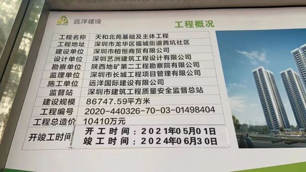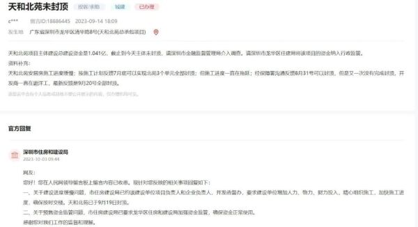 10月3日,深圳市住房和建设局就网友反映的问题回应称,“市住房建设局已约谈建设单位项目负责人和企业负责人,并发函督办,要求建设单位增加人力、物力、财力投入,精心组织施工,加快施工进度,确保按时交楼。天和北苑已于9月19日封顶。”
