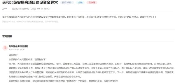龙华区住房和建设局称,“下一步,我局将加强与市住建局和银行沟通协调,尽快将天和北苑项目预售款资金账户纳入行政监管范围,严格监督开发企业专款专用。”
