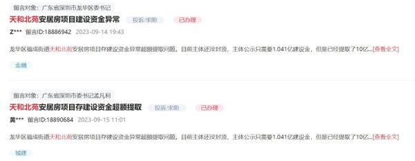 9月14日-15日,多名网友集中反映称,天和北苑项目存建设资金超额提取问题。主体建设总资金是1.041亿元,实际未完工就已经提取了10亿元,恳请有关部门介入调查,将资金纳入监管。