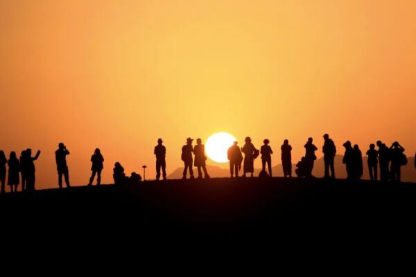 2023年9月11日清晨,游客在甘肃敦煌市鸣沙山月牙泉景区观赏日出。图/中新