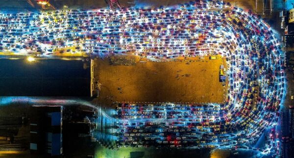 2018年2月21日晚,海南海口市,车辆在秀英港码头排序离港。图/视觉中国