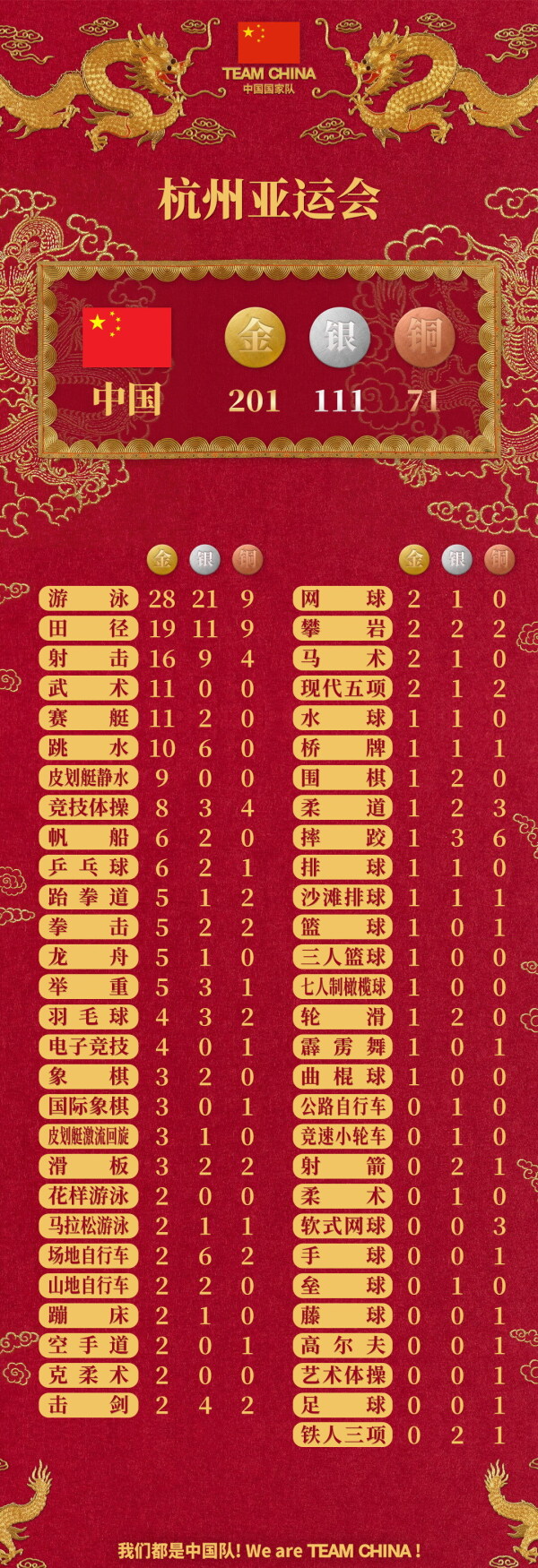 北京时间10月8日,杭州第19届亚运会最后一个比赛的产生了3枚金牌,坐拥东道主之利的中国体育代表团夺得了花样游泳集体项目金牌,最终金牌总数定格在了201枚,刷新了自己在广州亚运会上创造的199金纪录。
