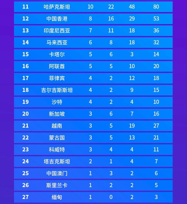 45个参赛国家和地区中,27个代表团有金牌入账,没有获得奖牌的只有不丹、马尔代夫、东帝汶和也门。