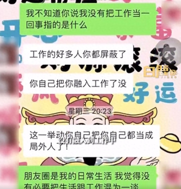 张女士(化名)称,自己突然收到老板发的信息,说觉得自己没有把工作当回事,询问原因是老板回复说自己朋友圈屏蔽了好多人,没有融入工作中,觉得自己不适合这份工作,之后又说同事觉得自己不合群。