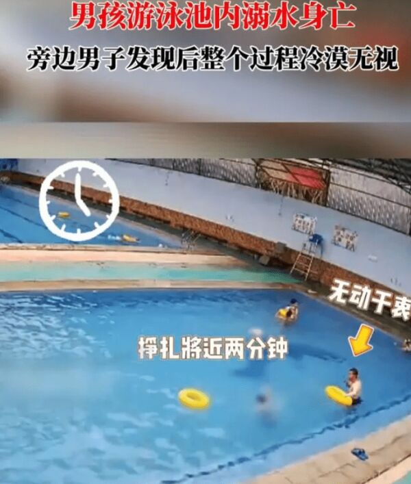 从监控录像中可以清晰地看到,男孩在游泳池中挣扎了整整2分钟,而旁边的一名成年男子注意到了这一情况。然而,令人震惊的是,这名成年男子并没有立即采取任何救援措施,而是静静地观看了长达6分钟。这段时间内,男孩一直在挣扎,但似乎没有得到任何帮助。