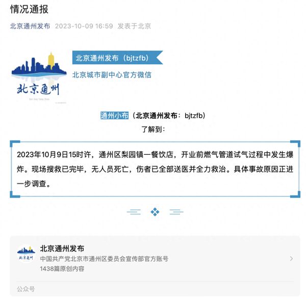 事情详述 北京通州发布消息,2023年10月9日15时许,通州区梨园镇一餐饮店,开业前燃气管道试气过程中发生爆炸。现场搜救已完毕,无人员死亡,伤者已全部送医并全力救治。具体事故原因正进一步调查。来源:北京通州发布 一餐饮店, 燃气管道, 北京一