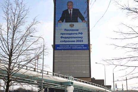 当地时间2月21日,俄罗斯总统普京在莫斯科发表国情咨文,图为一大楼外墙屏幕上播放的普京讲话 图源:外媒