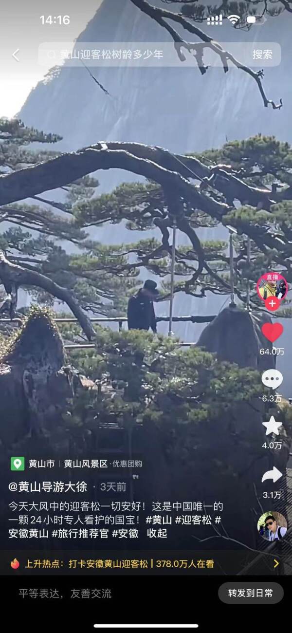 有一位“黄山导游大徐”今天在抖音上直播,他站在迎客松前为直播间的网友答疑,还指明了迎客松旁边守松人的办公室。